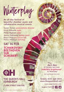 I’m preparing for next weekend’s Winterplay, my mini-festival of collaborative music at the Queen’s Hall in Edinburgh. We have a children’s music-and-movement workshop led by Monica Wilkinson, a music and words event with Janice Galloway, a pre-concert talk by Robert Philip and a trio concert. Violinist Erich Höbarth is about to arrive from Vienna and I’m so looking forward to rehearsing piano trios with him and cellist Philip Higham.