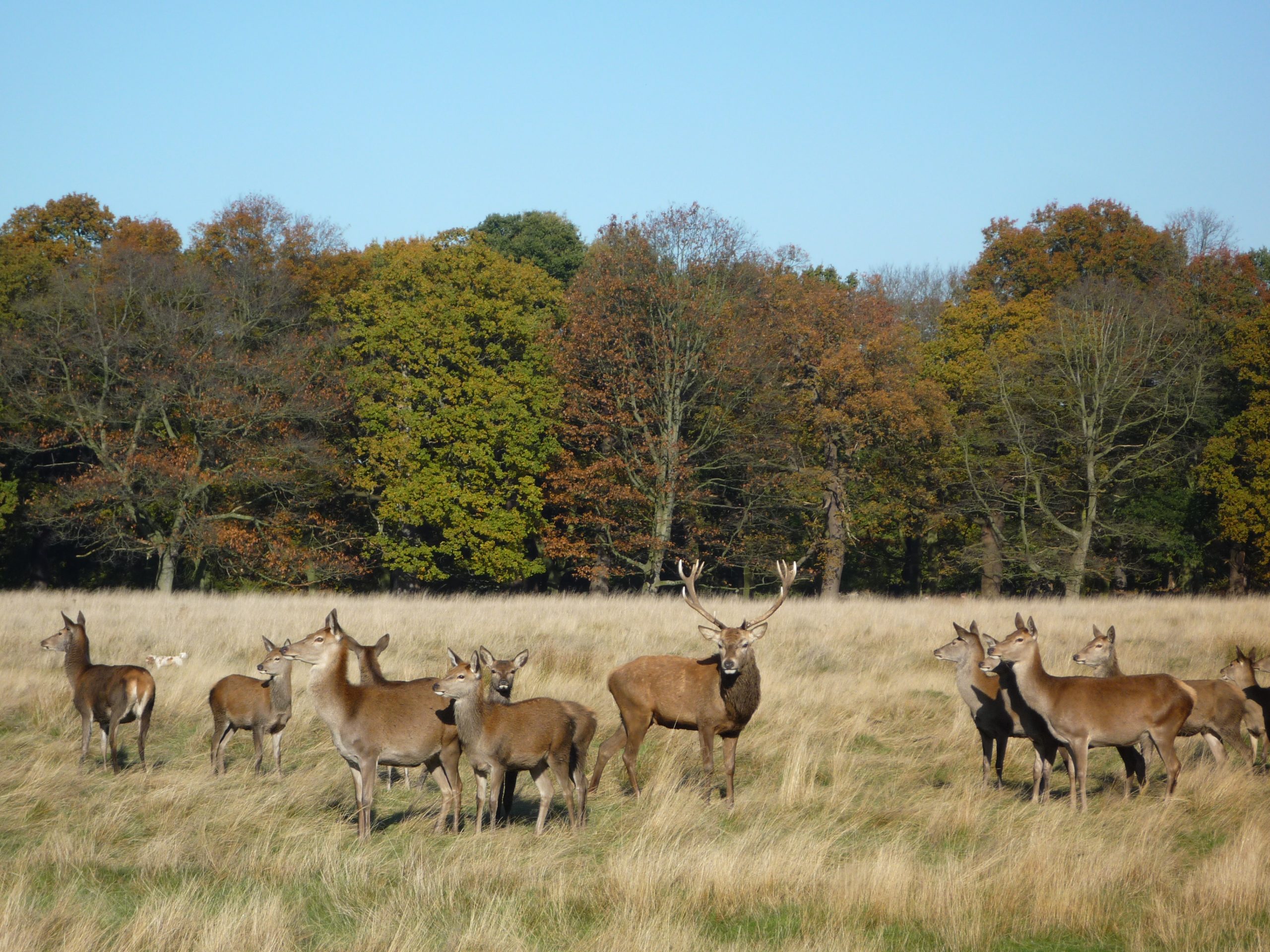 While we were watching this group of deer, we witnessed a ‘raid’ by another stag. He ran up to the group, and was chased away by the bellowing stag in charge. But a moment afterwards, several female deer – after what looked like a lightning review of their prospects – detached themselves from the group and ran after the interloper. A moment later we turned and saw the splinter group – the intruder and his new female companions – munching peacefully together on the other side of the lark meadow.