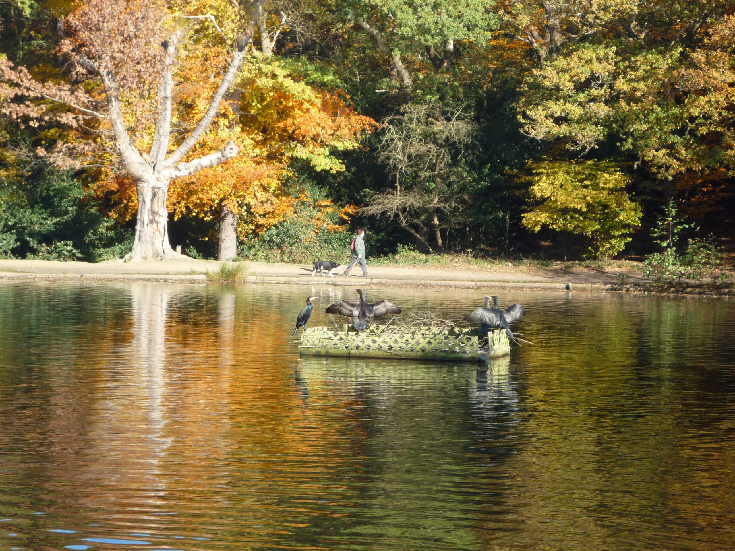 A group of cormorants arrived on our local pond this week. They stood drying their wings in the sun, monopolising a floating platform which had been abandoned in a hurry by the smaller, meeker birds who usually potter about on it.