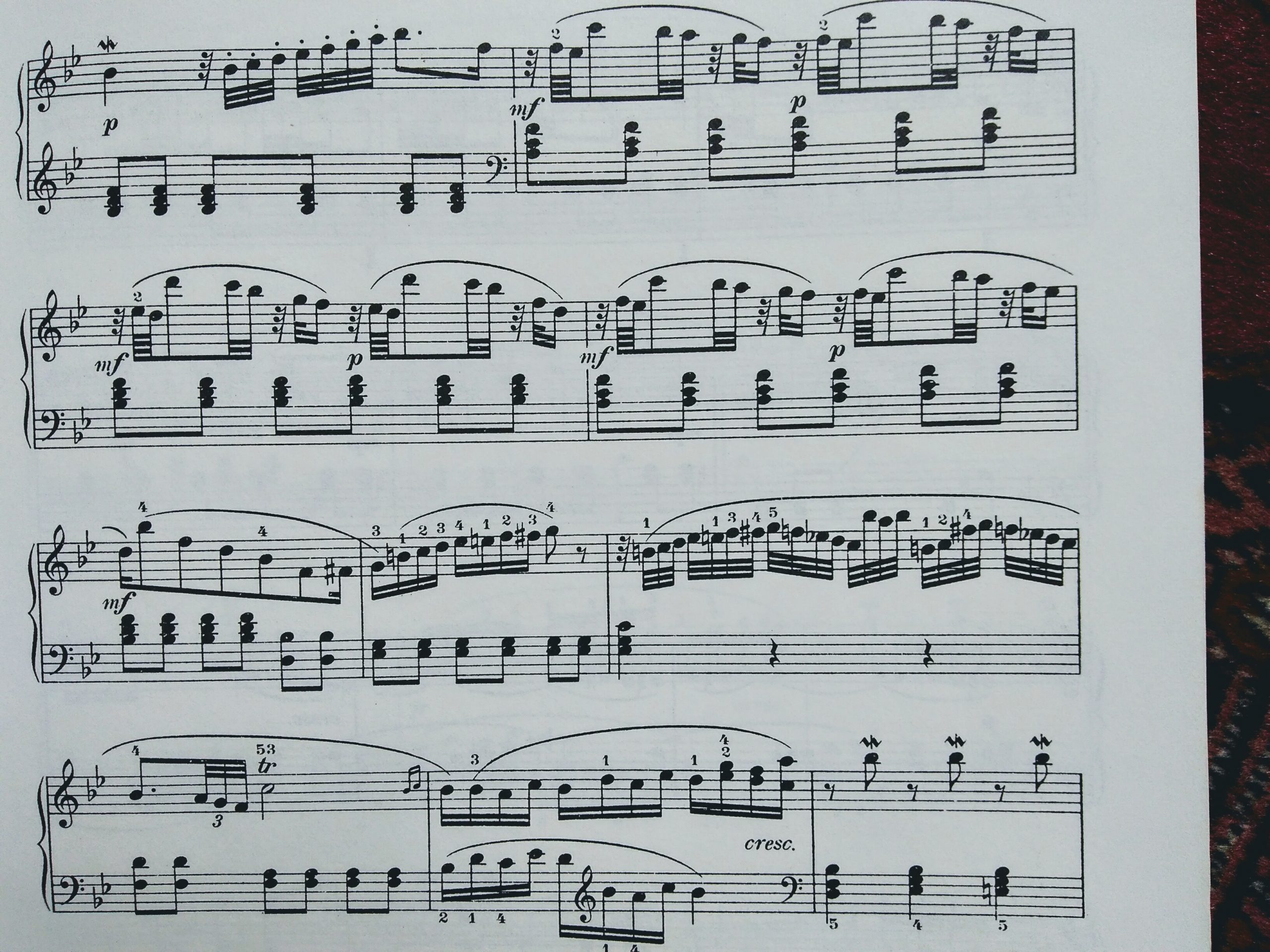 After eight bars, the mood suddenly changes. Still with the walking quavers in the bass, the right hand becomes skittish. And a few bars later (see photo), it breaks out into what I suppose is the 18th century equivalent of a little jazz riff. For three bars, it skitters between the quaver beats in a rhythm so complicated that I had to stare at it and do some mental arithmetic before I saw how it worked.