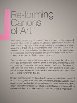 ‘In art history’, the signboard explained, ‘canons refer to works of ‘indisputable quality’ – pieces that have passed an ambiguous test of value, according to those who claim authority to speak and write about art. In Western culture, these authorities have historically been white men, leading to the exclusion and marginalisation of works by artists such as Black, Indigenous and people of colour, as well as women.’