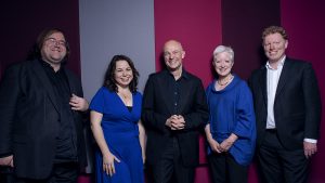 Phew! That was indeed a two-piano marathon at the London Piano Festival. Looking tired but happy after the three-hour concert last Saturday night in King’s Place are, from left to right, Christian Ihle Hadland, Katya Apekisheva and Charles Owen (co-directors of the festival), Susan Tomes, Tim Horton.