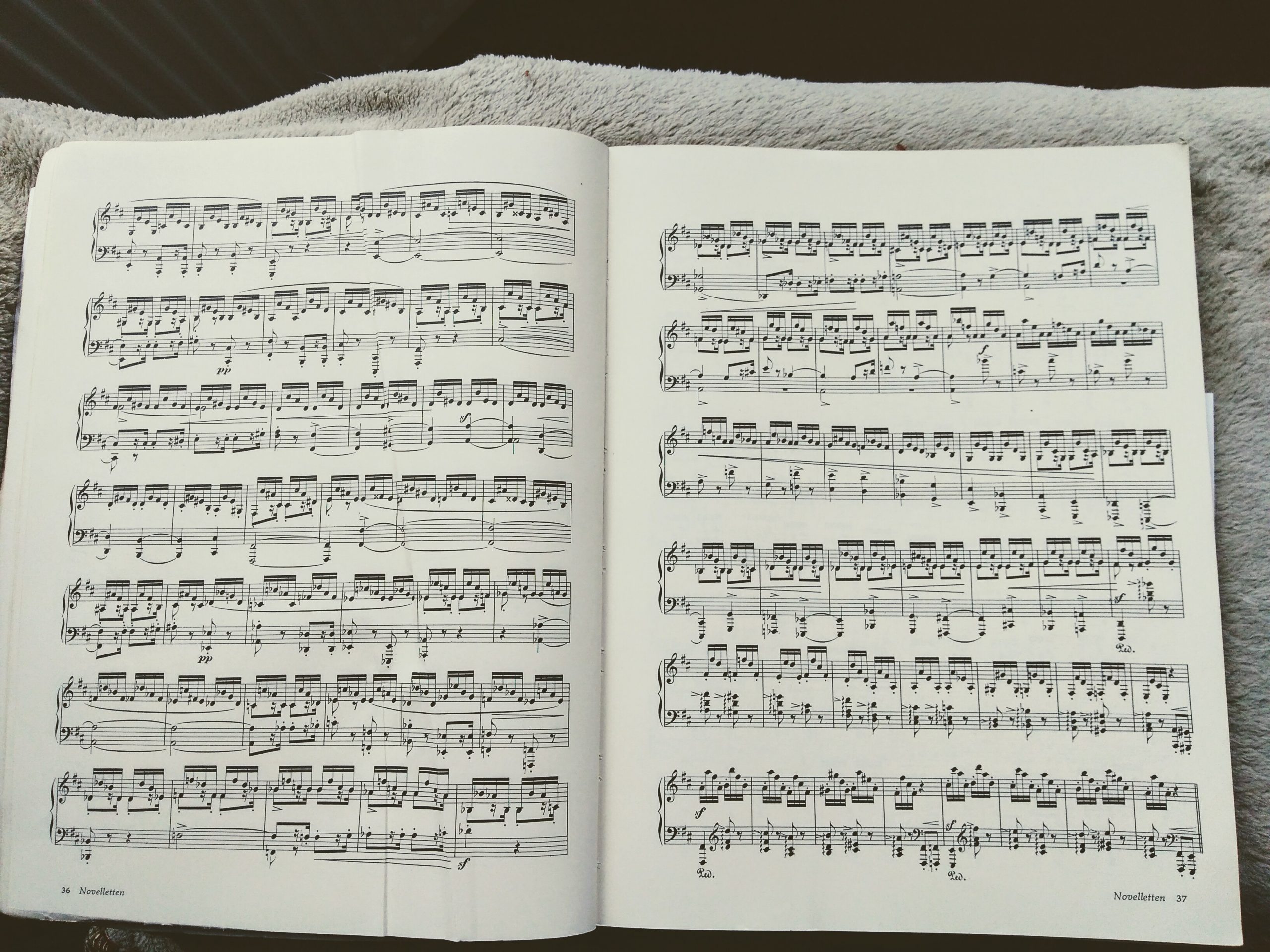 Over the years I’ve often thought that I should learn these pieces to concert standard and play them in recitals. I embark on practising them, only to become discouraged by pages and pages of airless figuration. The photo of a couple of pages from the Novelletten will indicate, even if you can’t see the notes clearly, the unvarying nature of the figuration, the lack of rests and silences. All his big pieces seem to have such pages, often in the final movement (where they are not welcome). I can visualise only too well the fidgeting I’ve noticed in the audience when Schumann gets into what modern listeners might call ‘OCD mode’. It happens in his chamber music too.